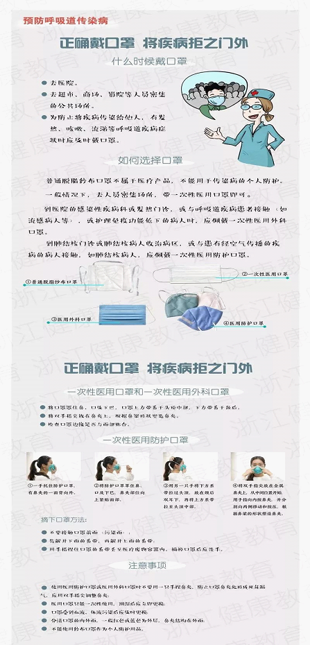 戴口罩是阻断呼吸道分泌物传播的有效手段。选择医用外科口罩能很好地预防呼吸道疾病。一次性医用口罩佩戴时,要将折面完全展开,将嘴、鼻、下颌完全包住,然后压紧鼻夹,使口罩与面部完全贴合。