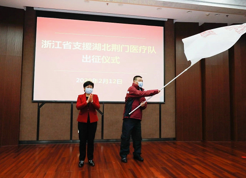 陈奕君副省长将“浙江省支援湖北荆门医疗队”队旗交给医疗队队长刘利民书记。