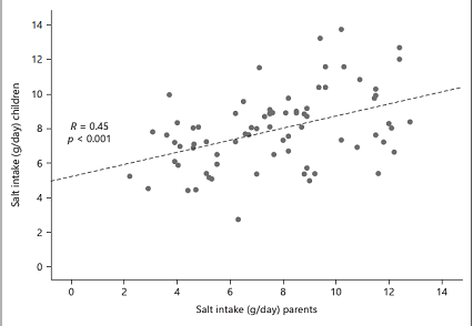图为子女及其父母的平均每日盐摄入相关性图。散在的点越集聚,相关性越强;虚线是儿童与父母之间盐摄入量的相关线。-1<R<1,R的绝对值越大,相关性越强。