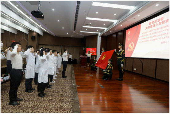 会议在国歌声中拉开序幕。首先进行了入党誓词宣誓,党委常务副书记、副院长黄昕领誓,新党员代表和其他与会党员共同面对党旗庄严宣誓。铿锵有力的铮铮誓言,表达了党员们对共产主义的理想信念和为共产主义奋斗终身的决心,促使党员牢记政治责任和历史使命,以更加饱满的热情投身本职工作。新党员代表心胸外科党支部沈涛同志发表入党感言。