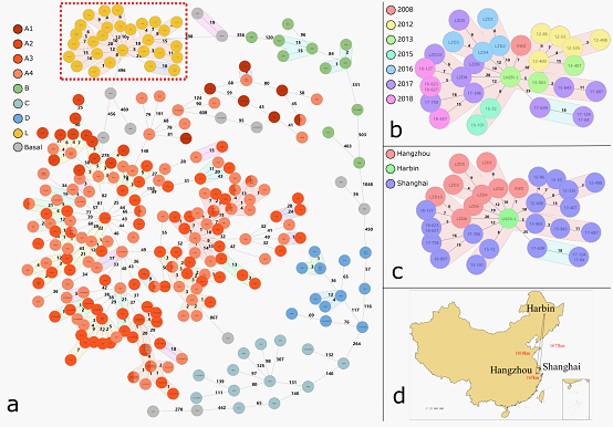 为了验证该cgMLST系统,课题组收集所有利奈唑胺耐药头状葡萄球菌的基因组作为检验基因组集,纳入菌株包括分离自杭州、上海和哈尔滨的菌株。检验基因组集与验证基因组集共同进行cgMLST分析(图一)和基于核心基因组SNP的系统发育分析(图二)。