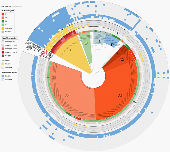 尽管菌株之间时空差异很大,绝大多数利奈唑胺耐药头状葡萄球菌均属于同一克隆,我们将这一克隆命名为L克隆。其他菌株在cgMLST分析结果中可以大致区分为4个主要克隆,将其命名为克隆A、克隆B、克隆C和克隆D。(图一)