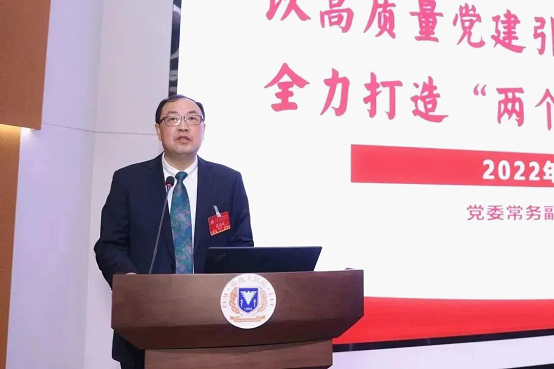 医院党委常务副书记兼副院长黄昕以《以高质量党建引领“双一流”建设,全力打造“两个先行”邵医金名片》为主题作党委工作报告。黄昕常务副书记指出,过去一年,围绕党的二十大胜利召开,医院牢牢把握正确政治方向,压实责任,全面从严治党,坚持和完善党委领导下的院长负责制,顺利完成新一届领导班子换届,促进党建和业务工作深度融合,在百分百完成巡视整改、深化党史学习教育成果、完善党管干部机制、提升基层组织力、加强宣传思想阵地管理、发挥民主党派参政议政作用、推进清廉医院建设等方面工作卓有成效,尤其是创新开展“支部共建强党建,健康共建促共富”党建引领医疗服务提升行动,为助力浙江省共同富裕示范区建设树立“邵医样板”。