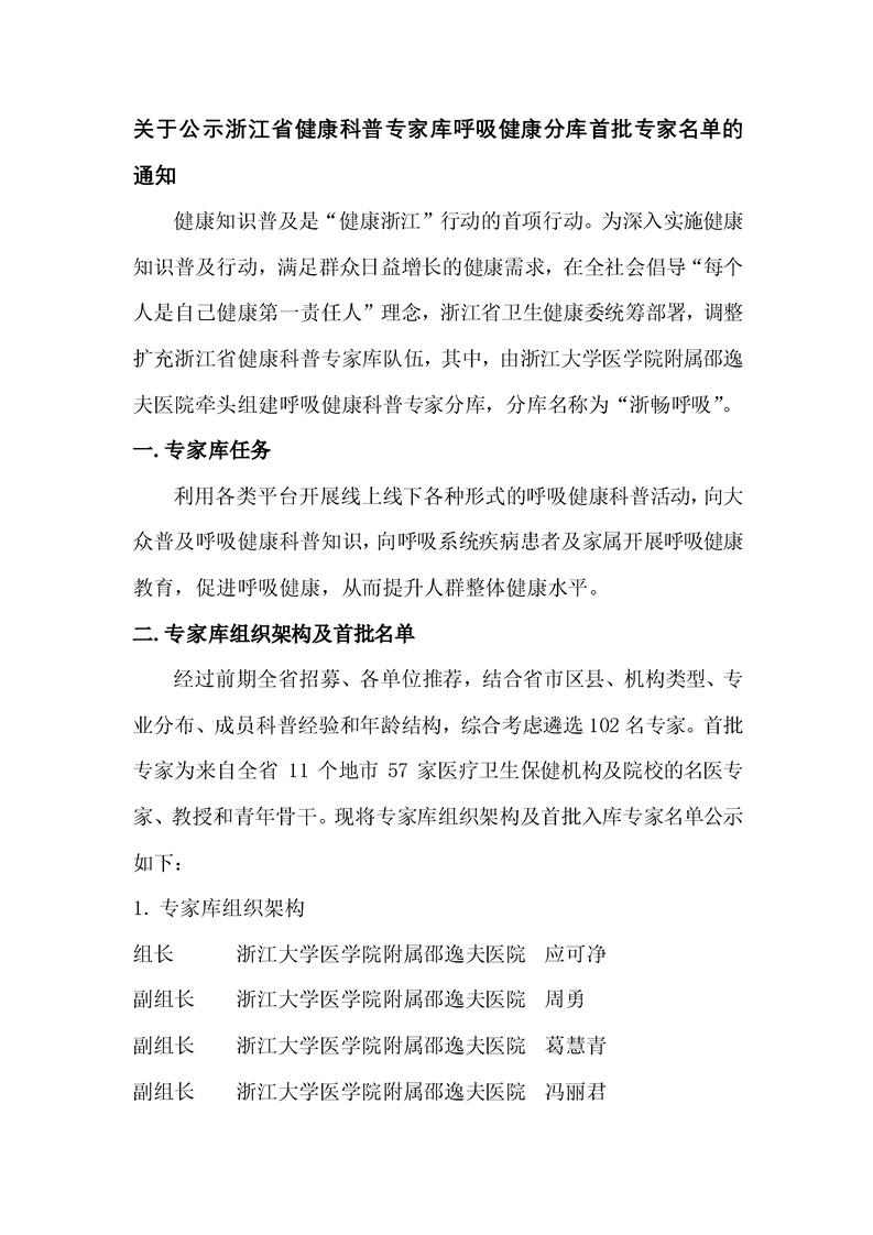 关于公示浙江省健康科普专家库呼吸健康分库首批专家名单的通知